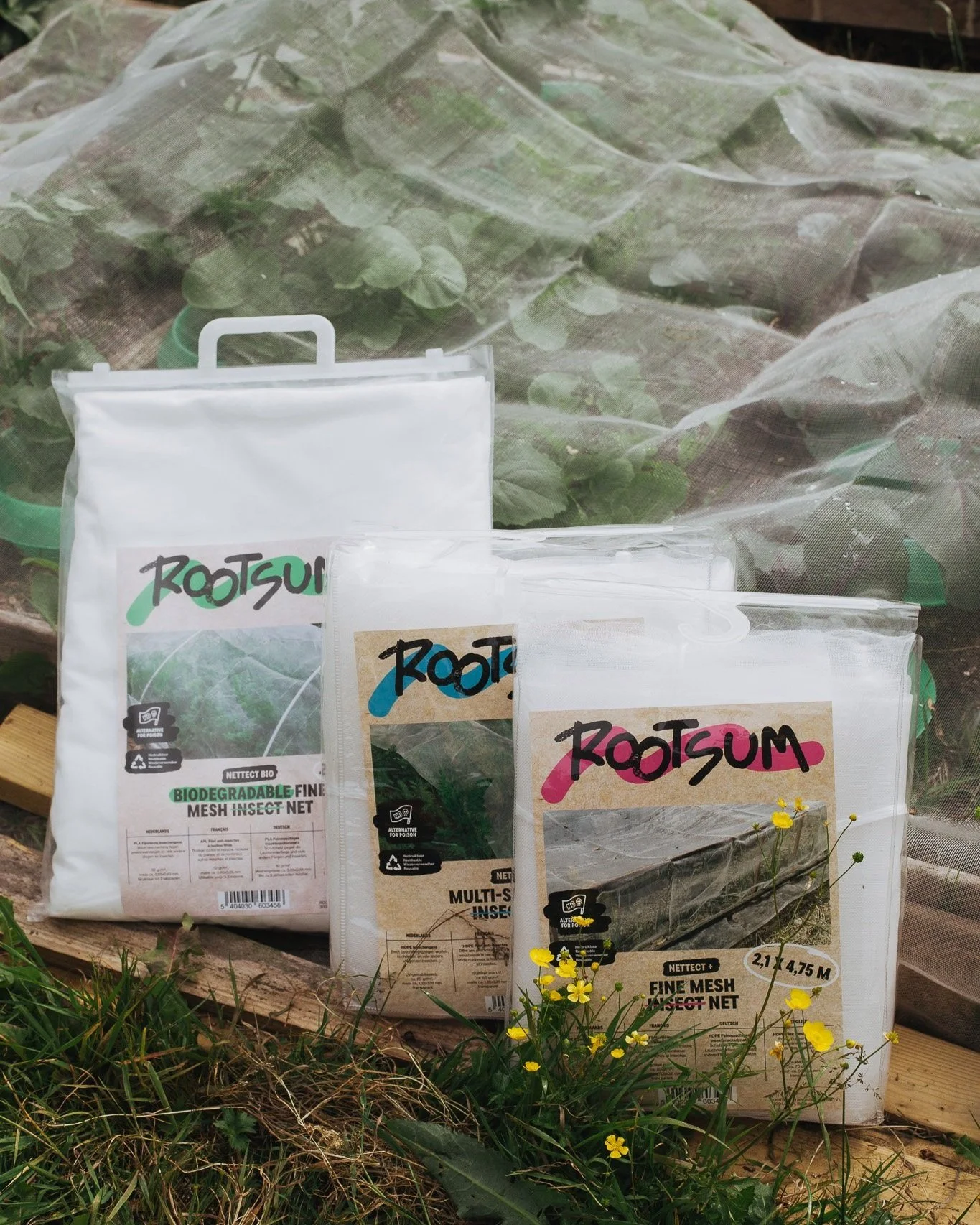 De drie verschillende netten van Rootsum voor in de moestuin
